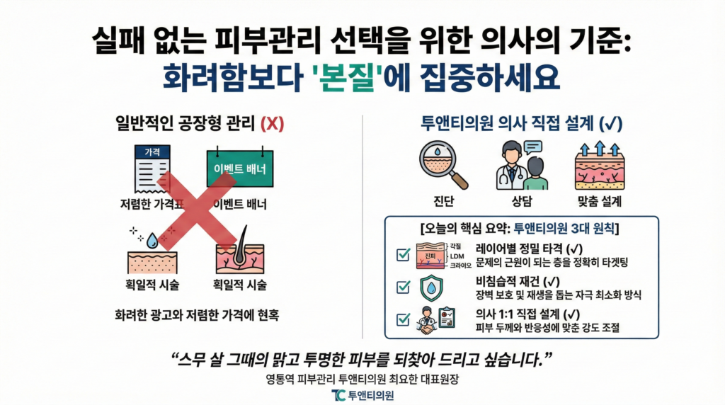 ※본 게시물은 의료법 제56조에 근거하여 의료정보 제공을 목적으로 투앤티의원에서 직접 작성된 글입니다. 모든 진료 및 시술 결과는 개인의 피부 상태, 연령, 생활습관 등에 따라 달라질 수 있습니다. 시술 전 반드시 의료진과 충분한 상담을 통해 적합 여부를 확인하시기 바랍니다. 환자분들의 건강하고 자연스러운 아름다움을 위해 항상 정직한 진료와 정확한 정보를 약속드립니다.