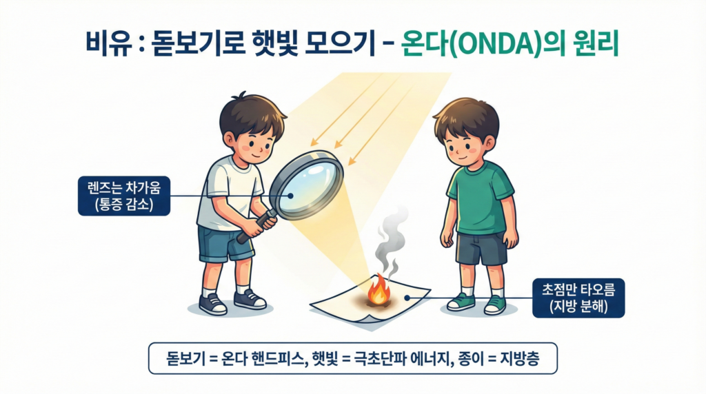 돋보기가 햇빛을 한 점으로 모아 종이를 태우듯, 이 시술은 피부 겉면은 차갑게 보호하면서 속 조직에만 열 에너지를 집중시키거든요.