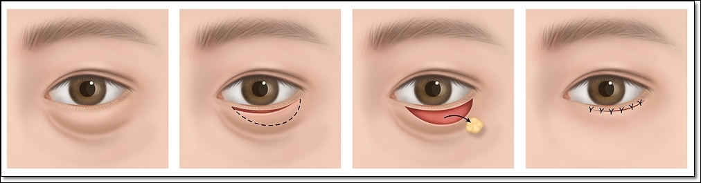 방식피부 절개 후 지방 제거 및 늘어짐 절제결막 안쪽으로 접근해 지방 재배치 및 레이저 시술