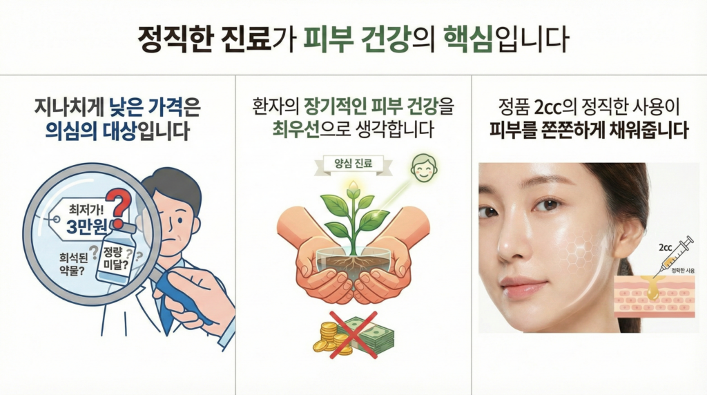제가 진료 현장에서 느끼는 리쥬란의 진짜 매력은 인위적인 변화가 아니라, 성분 자체가 가진 본연의 힘으로 피부가 서서히 맑고 탄탄해지는 과정을 지켜볼 수 있다는 점에 있습니다.