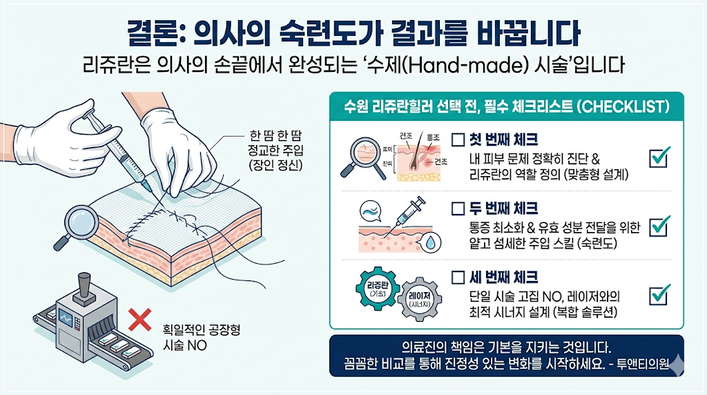 기계가 대신할 수 없는 의사의 ‘손맛’과 ‘정성’이 들어갈 때, 비로소 리쥬란은 단순한 시술을 넘어 피부를 살리는 진정한 보약이 될 수 있다고 믿기 때문입니다.