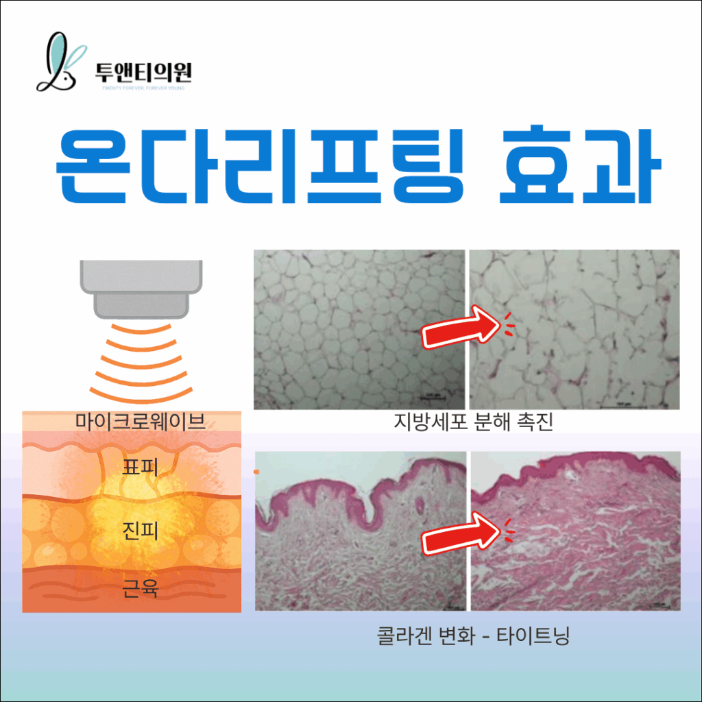 수원온다리프팅은 피부 속 수분 분자를 초당 수십억 번 진동시킵니다. 이때 발생하는 열에너지가 피하 지방층의 온도를 높입니다. 이렇게 높아진 온도는 불필요한 지방세포를 분해합니다. 동시에 진피층의 콜라겐 재생을 유도합니다.