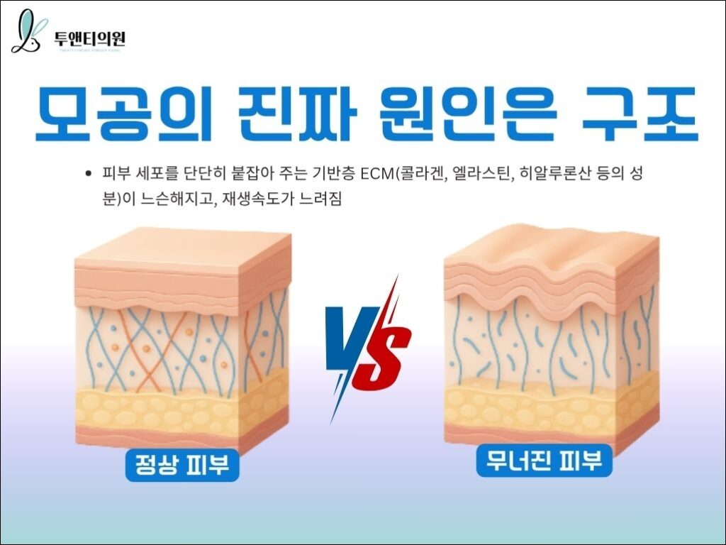 나이가 들거나 자극을 받으면 피부를 지탱하던 진피층의 콜라겐과 엘라스틴이 감소합니다. 기둥이 무너지면 천장이 내려앉듯, 피부 탄력이 떨어지면서 모공 입구가 느슨하게 늘어지는 것입니다.