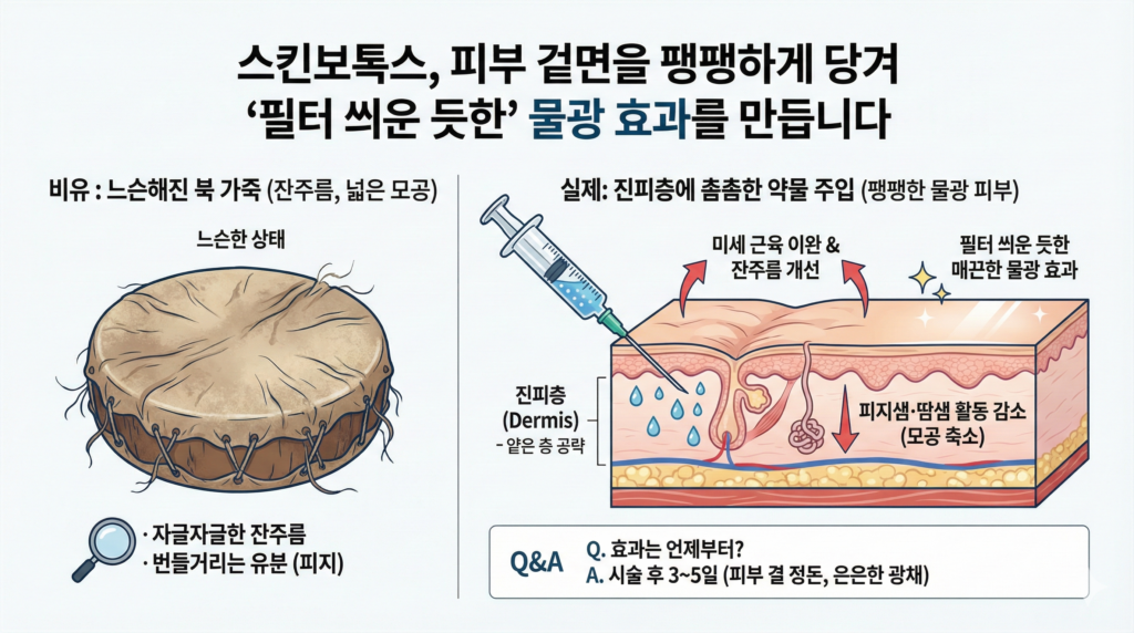 스킨보톡스 엠보싱 기간이 발생하는 근본적인 이유는 고농도의 약물이 피부의 촘촘한 진피층 사이에 머무르며 흡수될 시간을 기다리기 때문인데, 이는 피부가 약물을 서서히 받아들이는 지극히 정상적인 과정입니다.