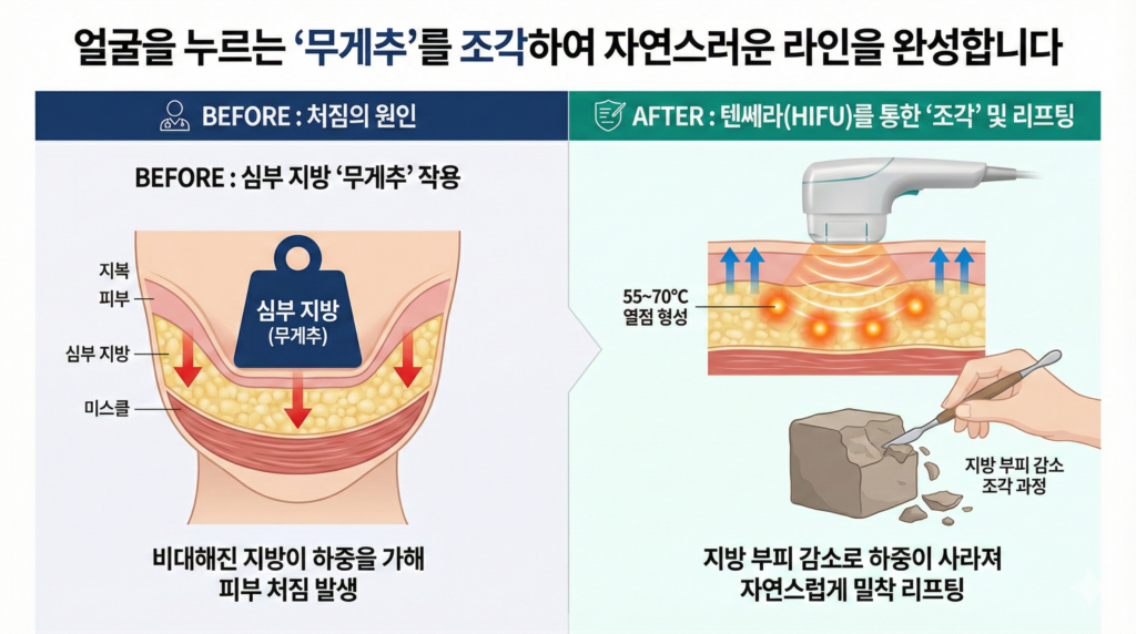 수원텐쎄라효과의 본질은 피부 겉면을 억지로 끌어올리는 것이 아니라, 얼굴 처짐의 주범인 피하지방층의 부피를 줄이고 느슨해진 근막(SMAS)을 수축시키는 데 있습니다.